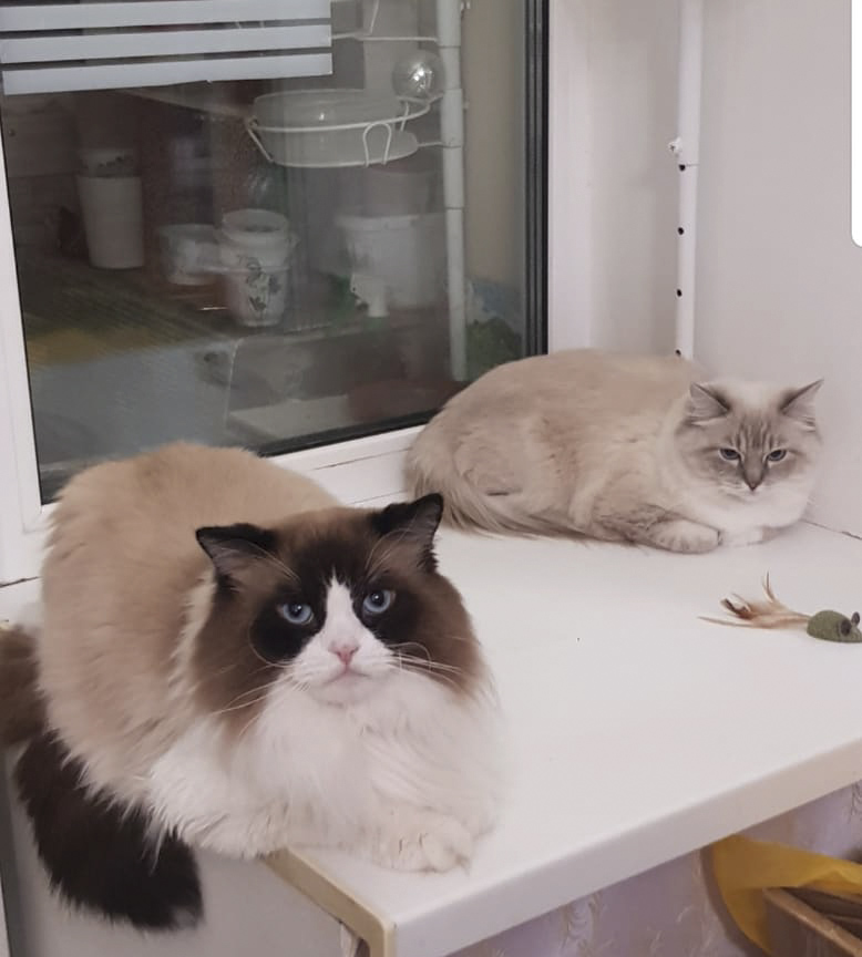 • Ch. Fixy RagVille & Ch. Upic Brise Krasa Shagola — Для Фикси это первый помет, она совсем молодая кошечка, в октября 2025 только получила титул чемпиона. Повязали с котиком окраса seal bicolor знакомой заводчицы. Так как Фикси окраса blue lynx mitted, то котята могут родиться в самых разных окрасах от голубого биколора до сил миттеда, при этом как линкс (с полосочками), так и без. Очень интересно, как сработает генетика )
